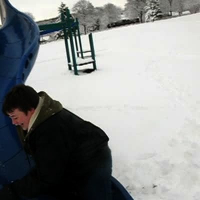 Teen boy tries to climb up a blue plastic slide at the park, he slides back down and hits a girl in the face with his butt. He knocks her down in the snow.