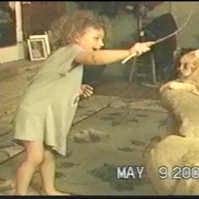 Tot girl hits cat with a stick. Cat scratches girl on the hand, she cries.