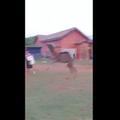 A Camel gallops around a field outdoors, chasing a screaming woman with a bucket.