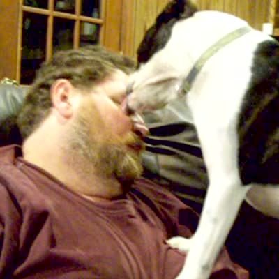 Man holds Boston terrier by a life jacket in the air in the yard. The dog wiggles and growls to be let down.
