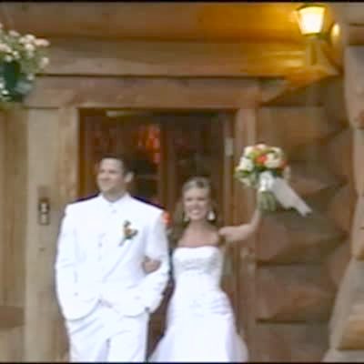 Bride & groom walk out of church & bride falls down stairs. She pulls groom on top of her. Wedding.