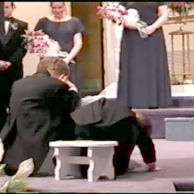 2 boys cover up ears during singing of "Here Comes the Bride" - then boys start pushing each other