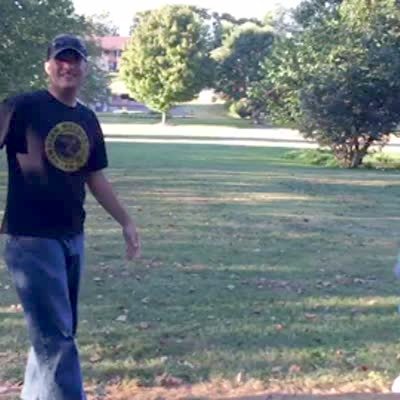 A man helps a young girl do a flip. The man tries to do the same with another man, but drops him when the other man when he is hit in the groin.