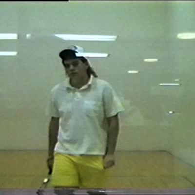 RACQUETBALL; Man playing racquetball notices the camera through glass, hits ball at camera, ball ricochets into his groin.