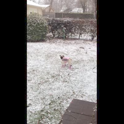 A pug dog attempts to walk and run outdoors in the snow while wearing dog mittens on all four paws.