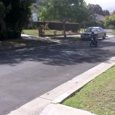 A teen boy doesn't make it when he attempts to jump over a kid on a motorized scooter. Crashes into kid's head and falls hard in street. Bonehead.
