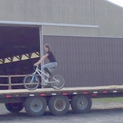 A teen girl rides a bicycle off of the back of a flatbed truck outdoors and falls.