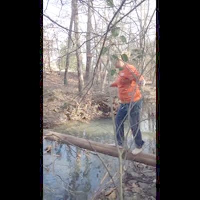 A woman walks cautiously across a log that runs across a creek/river but a branch that she's holding onto cracks and she swings around the log, falling head first into the water.