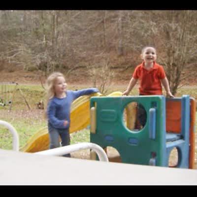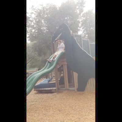 A boy and a girl are riding down a play set slide outdoors. Their grandmother tries to climb on to ride with them and tilts the entire play set over, falling, at 2:00.