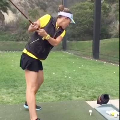 A woman hits a golf ball into a bag blowing by in slow motion outdoors.