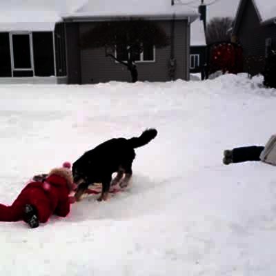 A woman goes down a hill on a sled with her kids when a black lab dog jumps right onto her and knocks them all off.