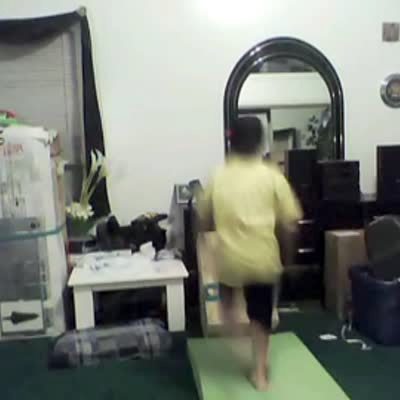 A cat struggles to walk in a pink shirt in a kitchen and falls face first into a bowl of food. Action starts at :50.