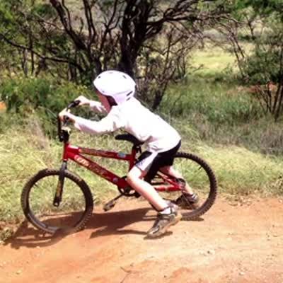 A dad is trying to show his five year old boy how to reverse his four wheeler. The boy drives into the dad's shin and laughs as the dad limps off.