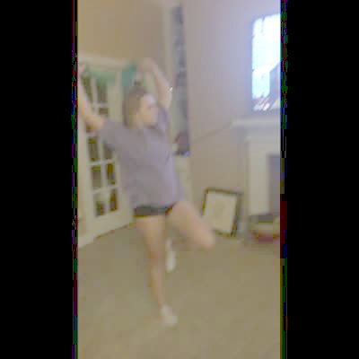 A young woman dances with a tissue box full of ping pong balls to shake them out before she falls backwards and knocks a closet door down.