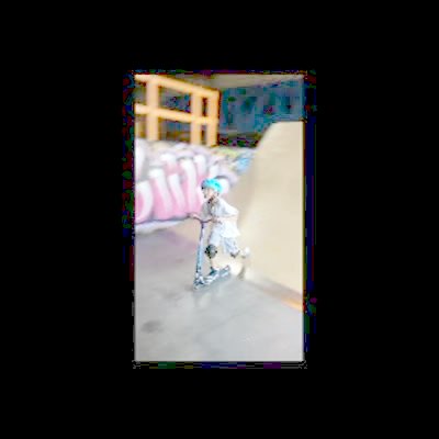 A young boy goes down one ramp and up another ramp on his scooter, but falls off the up ramp and his scooter goes back down the ramp without him indoors.