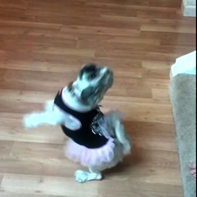 A Shih Tzu dog spins around in circles on its hind legs while wearing a TuTu.