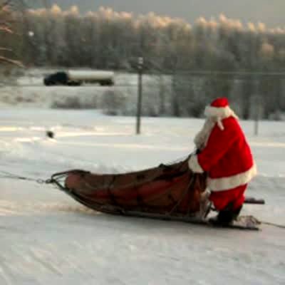 A man dressed as Santa Claus rides on a dog sled, tips over, falls off, and the dogs keep running.