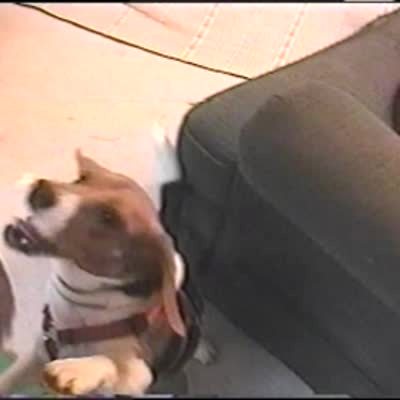 A pointer dog bites and snarls while a man clips its nails and a woman restrains it at home. The dog rocks back and knocks the woman off of the sofa.