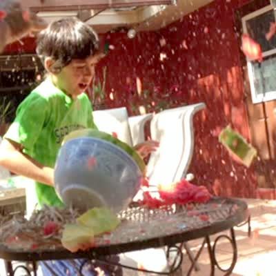 A young boy and his parents put rubber bands around a watermelon. It explodes all over them at :23.