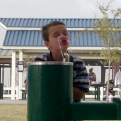Boy tries to drink from a water fountain at the park. Wind blows water all over him.