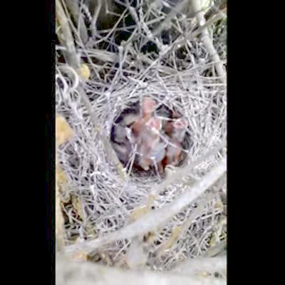 A man finds a bird's nest of baby birds in a bush and each time he sings, the baby birds hold their heads up with their beaks open.