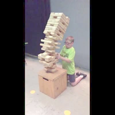 A stack of large jenga blocks falls on a young boy in slow motion.