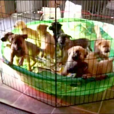 Puppies sleep in their cage. The all wake up and hop up when woman says "Good morning" to them. They run out to see woman.