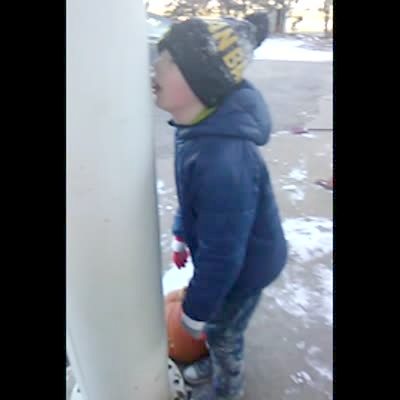 A young boy licks a pole and gets his tongue stuck. The boy asks for help while his family records video, laughs, and takes photos.