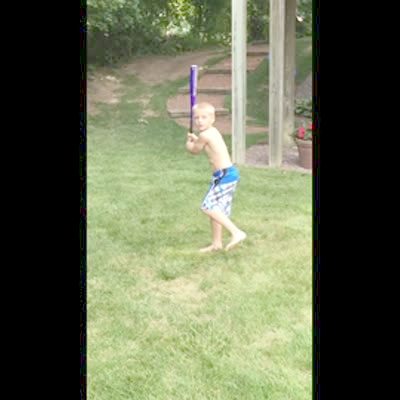A little boy hits a water balloon with a baseball bat in slow motion outdoors. AA: super slo-mo balloons