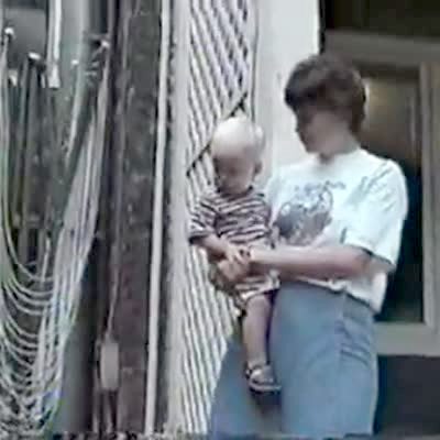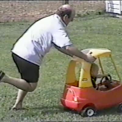 Boy rides rocking horse on patio, then Dad tries to ride as well and breaks it. Bonehead.