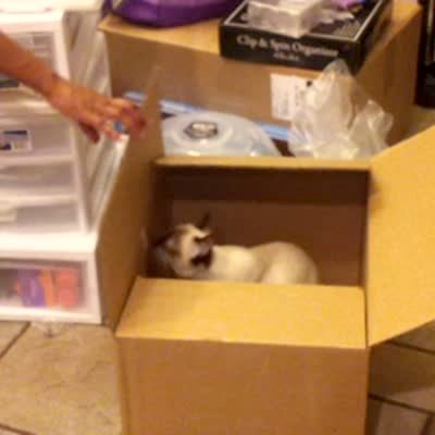 A Siamese cat inside of a box springs up out of in in fright when a dog walks past at home.