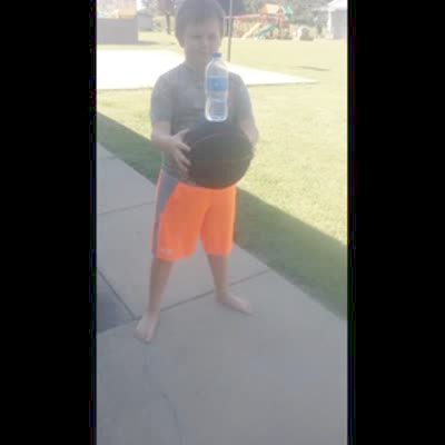 A young boy fails at doing a bottle flip on basketball and the water bottle hits him in the groin.