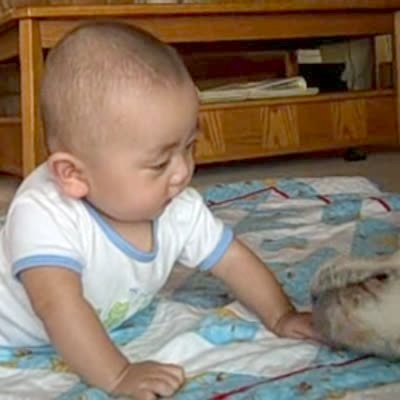 Baby boy lays on the floor next to a dog, dog licks baby's entire face. Baby's mouth is open & dog's tongue goes into his mouth. Gross.
