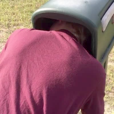 A boy gets his head stuck in a mailbox outdoors. A girl pulls him out on the count of three and they fall backwards.