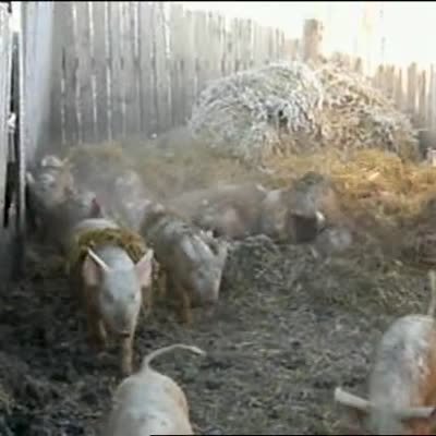 Woman pounds the side of a barn until a bunch of pigs wake up and crawl out from underneath a pile of hay. Farm.