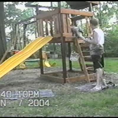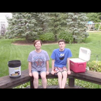 A teen boy trips and falls off of a porch while trying to pick up a bucket to pour over a teen boy's head outdoors. edited. ALS Ice Bucket Challenge