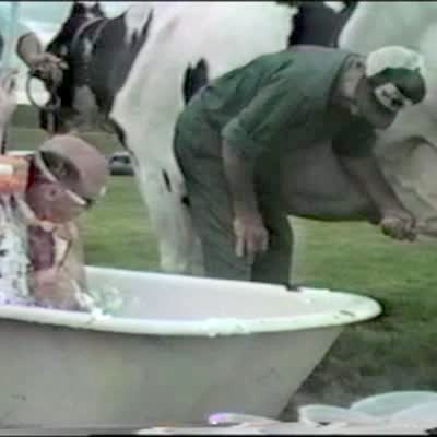 A man hides in the shower and slams a pie in his face. The video plays again in slow motion.