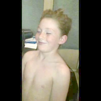 A young boy stands in front of a leaf blower as it blows on him in slow motion.