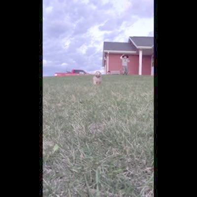 Water balloon fight; man chases woman with water balloon over his head has it break and wet him