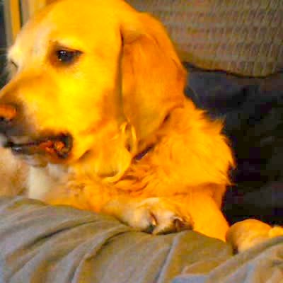When a woman touches Golden Retriever's paw, dog makes a growling face. No growl noise, just the face.