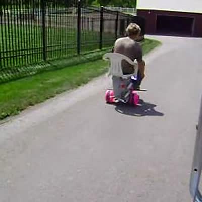 Teen boy rides in homemade cart made of a trash can, patio chair, & a scooter. It falls apart & teen falls down.