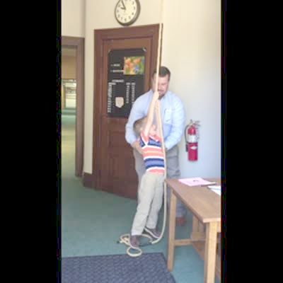 A young boy holds on to a rope to ring a church bell and his dad lifts him up and the boy smacks right into the ceiling.