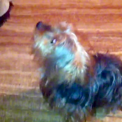 A small Yorkie dog perks its ears up when a woman says "cookies" and down when she says "no" indoors.