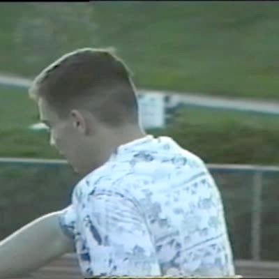 Teen boy holds a frog on a card in the yard, frog jumps at boy, boy tries to get out of the way. Scared.