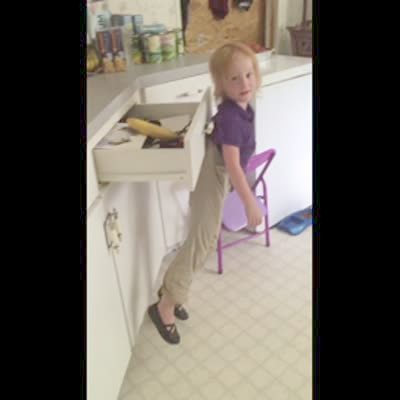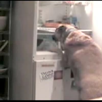 "Cold-Blooded Canine" Big dog opens refrigerator door & takes out food, then pulls out an entire shelf, leaving the fridge almost empty. Destroys fridge. Hidden camera. Blurry camera. Long for edit. Needs pull ups