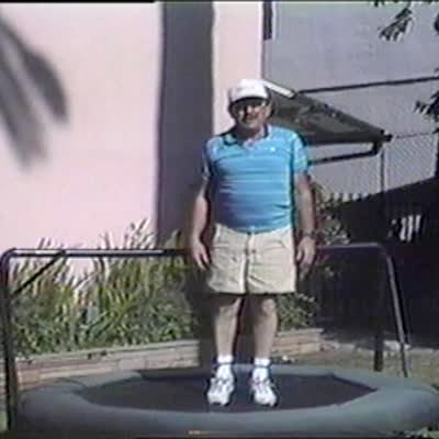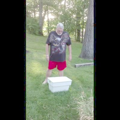 A senior man stands outdoors and picks up a Styrofoam cooler of water to dump on himself but when he lifts it up, the Styrofoam breaks apart and the water spills everywhere. ALS Ice Bucket Challenge.