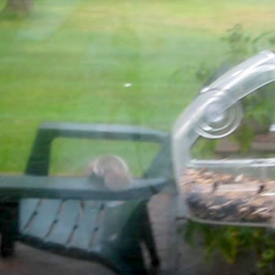 Squirrel jumps from deck chair to bird feeder on sliding glass door on back porch.