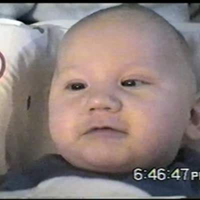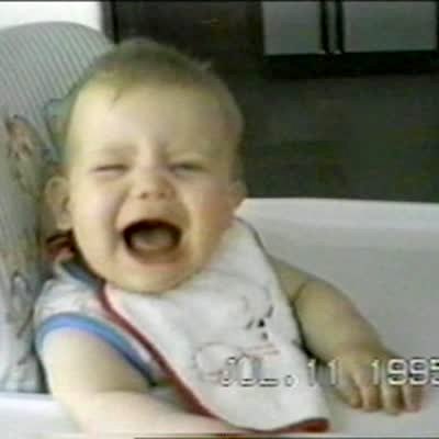 Dad makes weird sound effects off screen when baby opens mouth - it looks like baby is screaming for food. eating, first foods