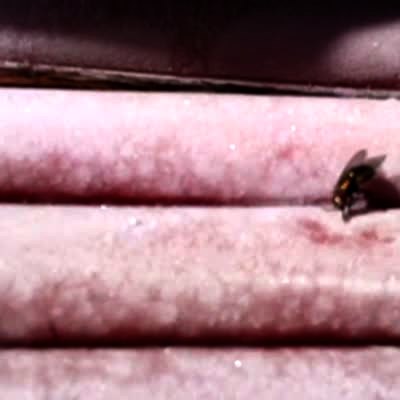 A fly gets stuck to a frozen hot-dog outdoors after trying to lick it. The fly wiggles and pulls his legs and wings but is unable to detach its tongue from the hot-dog until the end.