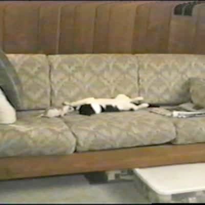 Rat sneaks up on cat sleeping on the couch. Rat pokes the cat with its nose, the cat wakes up & wrestles the rat, throws it off the couch into the air.